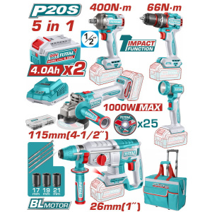 Total Επαγγελματικό Σετ 5 Εργαλείων Μπαταρίας Li-ion 20V, 4Ah, Με 2 Μπαταρίες Και Θήκη TCKLI20592E