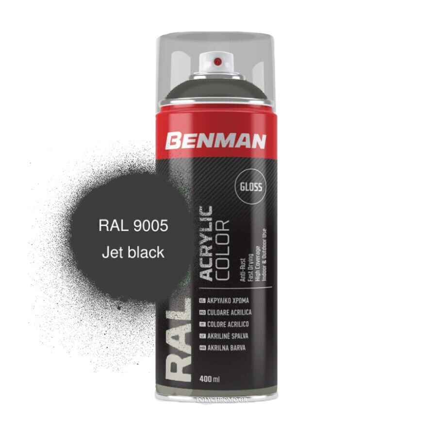Ακρυλικό σπρέι βαφής Benman Jet Black RAL 9005 400ml με γυαλιστερό φινίρισμα, ιδανικό για ανθεκτική και επαγγελματική βαφή.