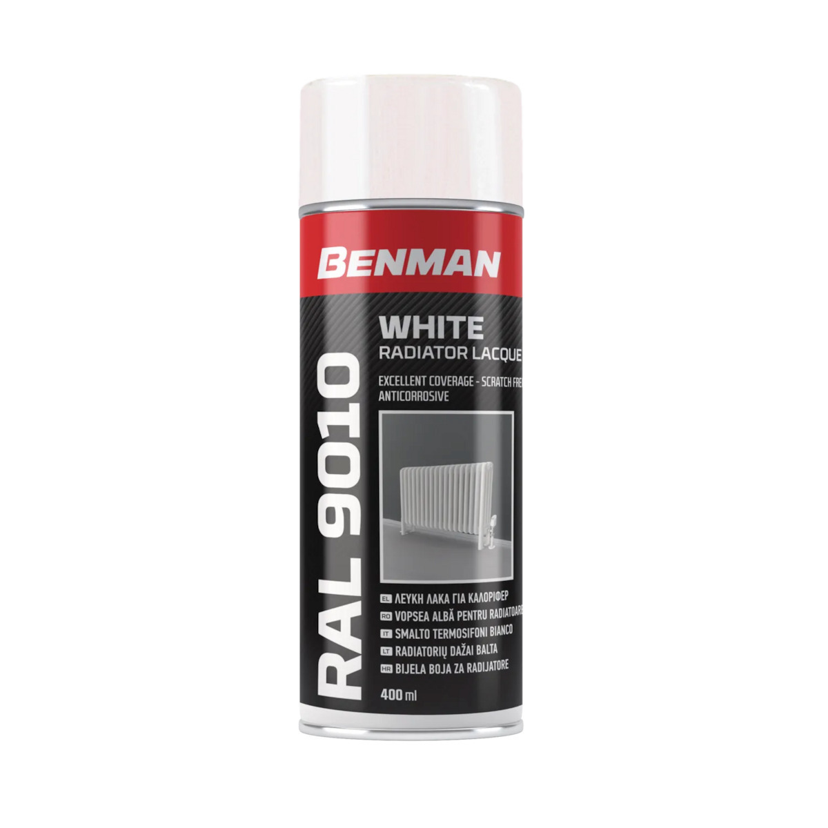 Σπρέι βαφής Benman για καλοριφέρ λευκό RAL 9010 400ml, ανθεκτικό στη θερμότητα, δεν κιτρινίζει και προσφέρει ομοιόμορφο, επαγγελματικό φινίρισμα.