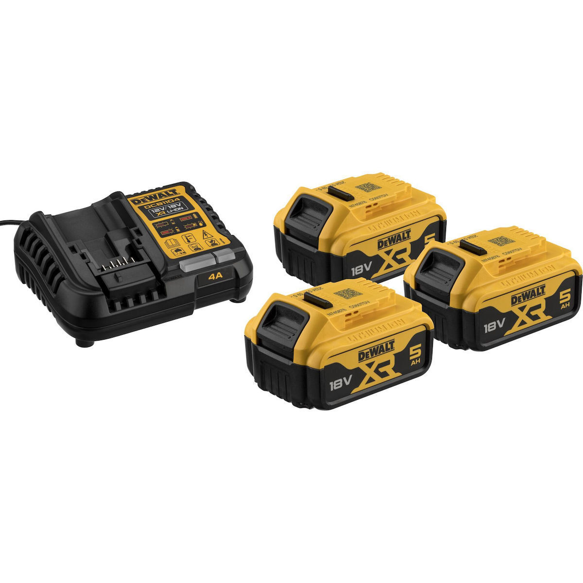 Περιλαμβάνει τρεις μπαταρίες λιθίου XR 18V 5Ah και έναν φορτιστή ταχείας φόρτισης DCB1104, εξασφαλίζοντας συνεχή λειτουργία χωρίς διακοπές.