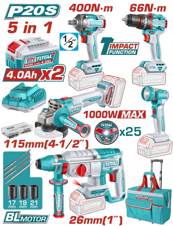 Επαγγελματικό σετ Total 20V με 5 brushless εργαλεία, 2 μπαταρίες 4Ah, πλούσια αξεσουάρ και τσάντα μεταφοράς για μέγιστη απόδοση και αυτονομία.