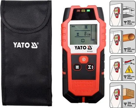 Ψηφιακός ανιχνευτής Yato YT-73131 για εύκολη ανίχνευση καλωδίων, μετάλλων, ξύλου και σωλήνων πίσω από τοίχους ή γυψοσανίδες, με LCD οθόνη και ηχητική/οπτική ένδειξη.